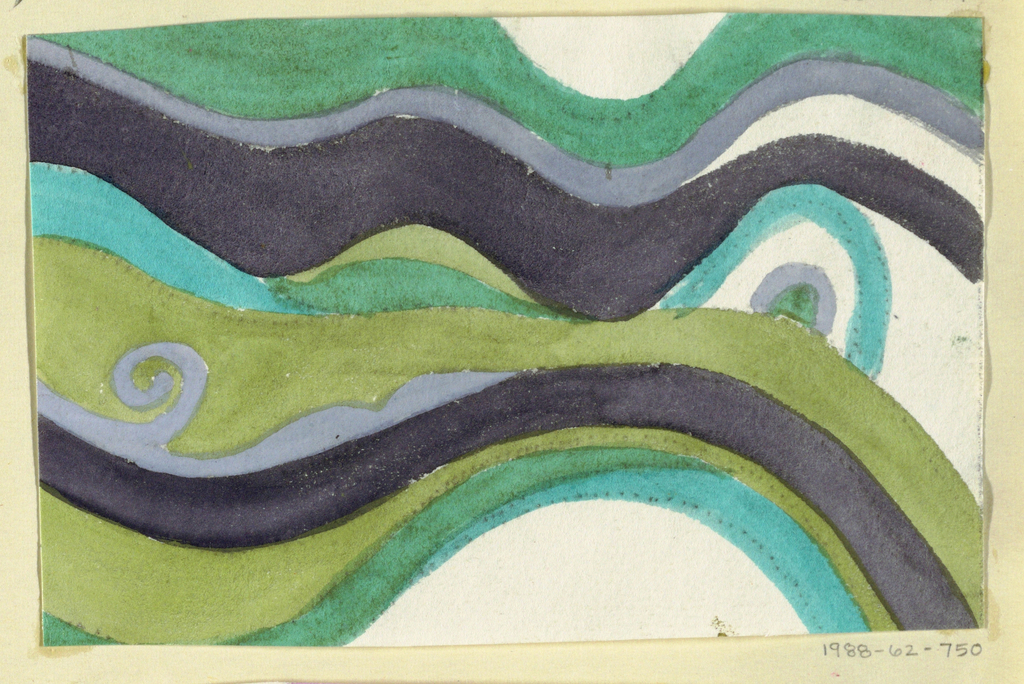Drawing, Textile Design: Marina; Designed by Dagobert Peche (Austrian, 1887–1923, active Vienna, 1911–1923); Made for Wiener Werkstätte (Austria); brush and gouache on paper; 9.2 × 14 cm (3 5/8 × 5 1/2 in.) Mat: 31.6 × 45.2 cm (12 7/16 × 17 13/16 in.); Museum purchase from Smithsonian Collections Acquisition and Decorative Arts Association Acquisition Funds; 1988-62-750