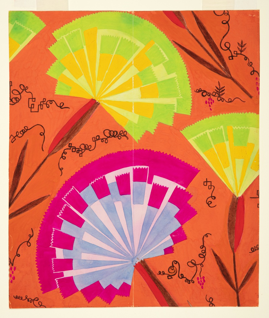 This is a Drawing. It was designed by Felice Rix-Ueno and made for Wiener Werkstätte. It is dated 1924 and we acquired it in 1988. Its medium is brush and gouache, graphite on paper. It is a part of the Drawings, Prints, and Graphic Design department.