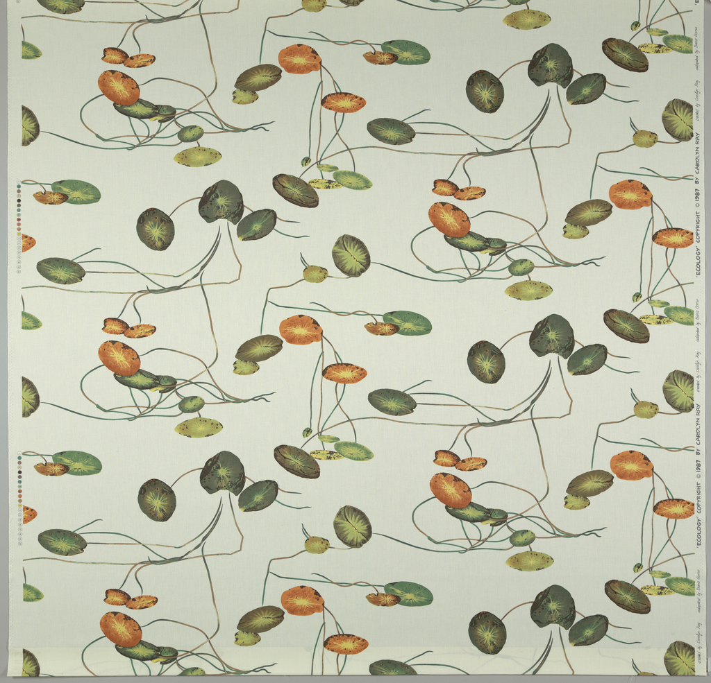 Textile, Ecology; Designed by Carolyn Ray; Company: Carolyn Ray Inc.; Made by Heberlein Textildruck AG (Switzerland); USA; cotton; Warp x Weft: 272.4 x 140.3 cm (8 ft. 11 1/4 in. x 55 1/4 in.) selvedge to selvedge Vertical offset repeat H x W: 54.6 x 66.7 cm (21 1/2 x 26 1/4 in.); Gift of Carolyn Ray Inc.; 1988-91-3