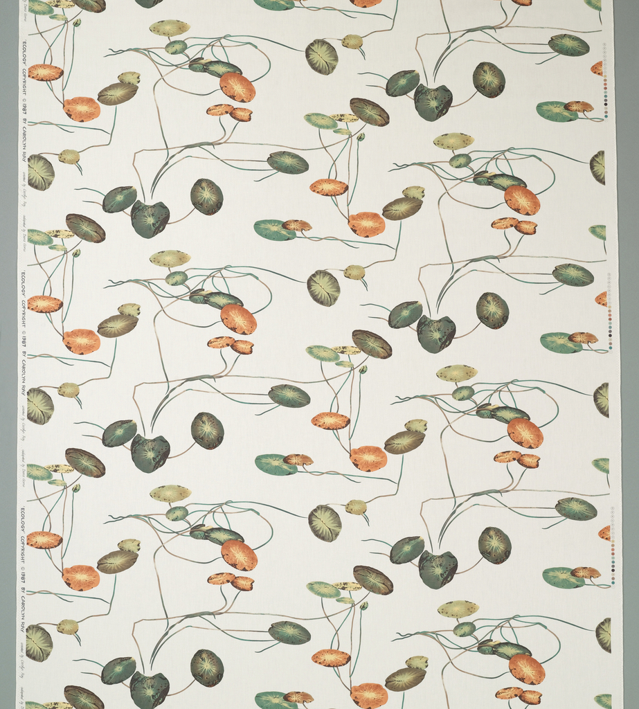 Textile, Ecology; Designed by Carolyn Ray; Company: Carolyn Ray Inc.; Made by Heberlein Textildruck AG (Switzerland); USA; cotton; Warp x Weft: 272.4 x 140.3 cm (8 ft. 11 1/4 in. x 55 1/4 in.) selvedge to selvedge Vertical offset repeat H x W: 54.6 x 66.7 cm (21 1/2 x 26 1/4 in.); Gift of Carolyn Ray Inc.; 1988-91-3