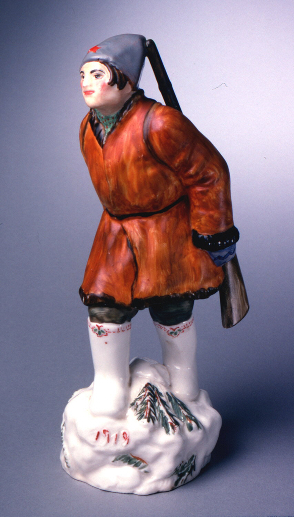 Partisan on the March Figure; Designed by Natalya Yakovlevna Danko (Russian, b. Georgia, 1892–1942); Manufactured by State Porcelain Factory (Russia); enameled porcelain, overglaze pigment?; H: 20.5 cm (8 1/16 in.); The Henry and Ludmilla Shapiro Collection; Partial gift and partial purchase through the Decorative Arts Association Acquisition and Smithsonian Collections Acquisition Program Funds; 1989-41-119