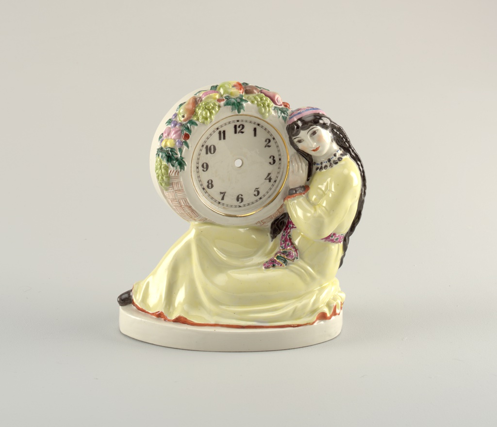 Clock Case with Uzbek Woman Figure; Designed by Natalya Yakovlevna Danko (Russian, b. Georgia, 1892–1942); Manufactured by Lomonosov Porcelain Factory (Russia); gilt and enameled porcelain; 22.7 cm (8 15/16 in.); The Henry and Ludmilla Shapiro Collection; Partial gift and partial purchase through the Decorative Arts Association Acquisition and Smithsonian Collections Acquisition Program Funds; 1989-41-169