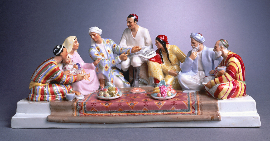 Uzbeks Discussing the Stalin Constitution Inkwell; Designed by Natalya Yakovlevna Danko (Russian, b. Georgia, 1892–1942); Manufactured by Lomonosov Porcelain Factory (Russia); enameled porcelain; H x W x D: 17.1 × 40.6 × 20.6 cm (6 3/4 in. × 16 in. × 8 1/8 in.); The Henry and Ludmilla Shapiro Collection; Partial gift and partial purchase through the Decorative Arts Association Acquisition and Smithsonian Collections Acquisition Program Funds; 1989-41-189-a/e