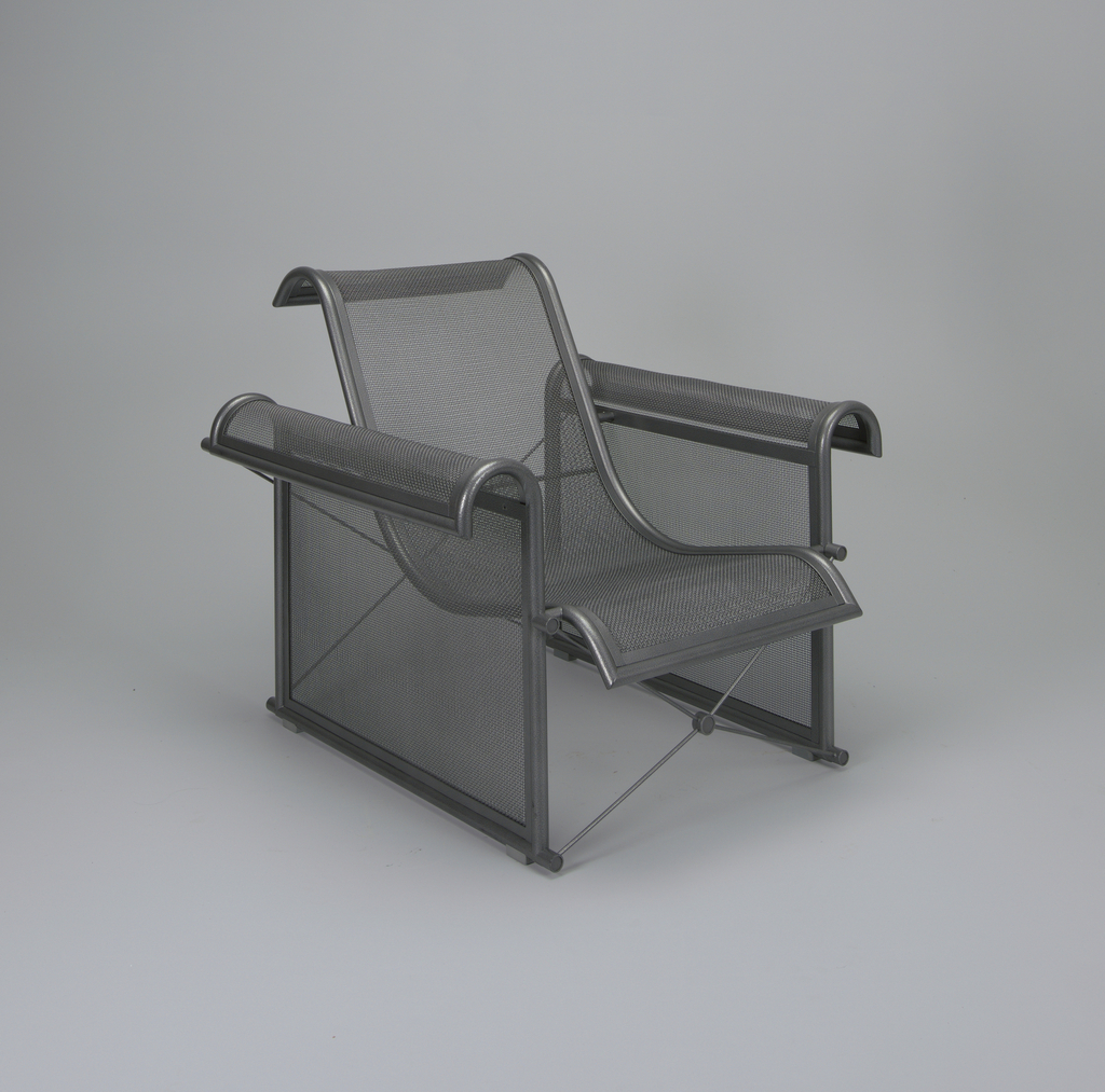 This is a Armchair. It was designed by Ronald Cecil Sportes and manufactured by JG Furniture Systems, Inc.. It is dated 1984 and we acquired it in 1989. Its medium is enameled, molded mesh steel. It is a part of the Product Design and Decorative Arts department.