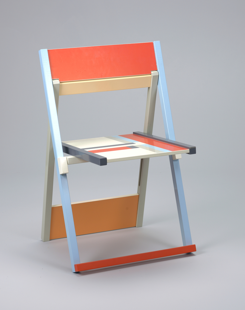 This is a chair. It was designed by Igor Cronsloe and produced by Living Design International. It is dated 1983 and we acquired it in 1990. Its medium is painted wood. It is a part of the Product Design and Decorative Arts department.