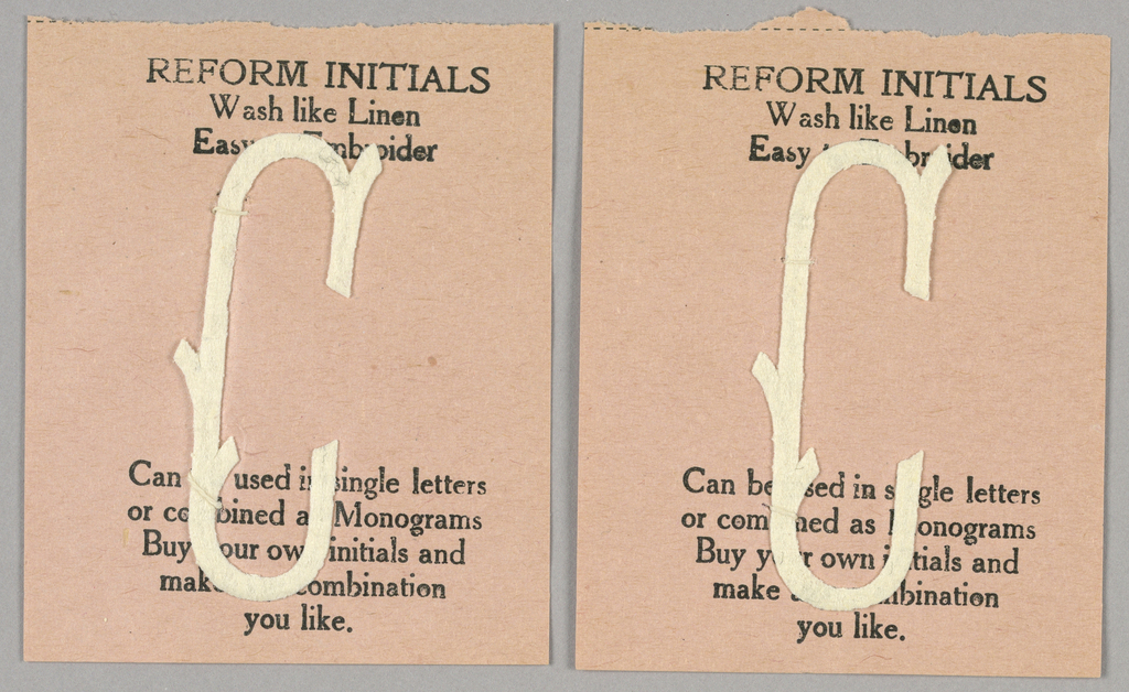 Embroidery Form, Crowley's Fiber Letter Foundations for Embroidery; Distributed by Crowley's Department Store (United States); USA; pressed cotton and synthetic felt, cotton thread, letterpress on colored wove paper; 9 x 7.4 cm (3 9/16 x 2 15/16 in.); Gift of Mickey Mariash; 1990-35-19-1,2