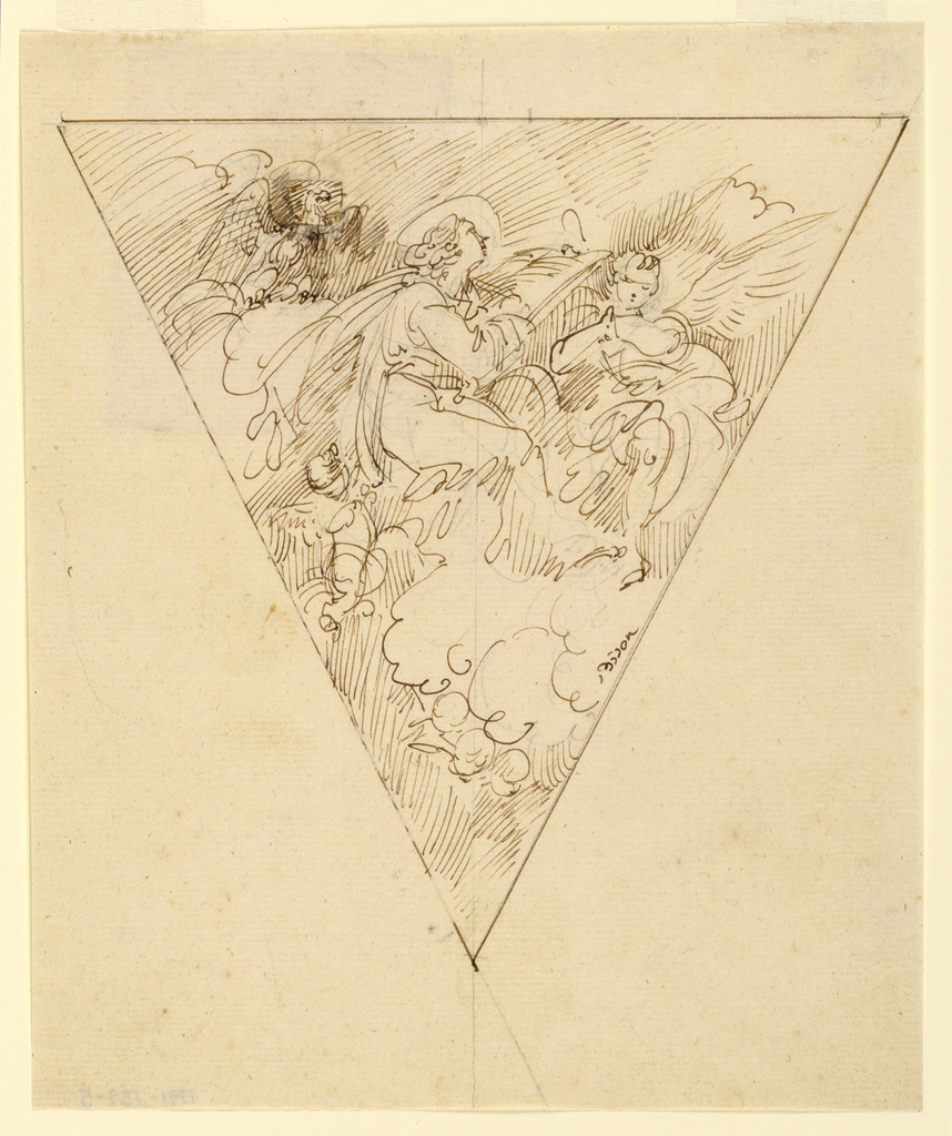 Drawing, Design for Pendentive: Sa; Giuseppe Bernardino Bison (Italian, 1762 - 1844); Italy; pen and brown ink, graphite support: cream laid paper; inlay correction; 21.1 x 17.2 cm (8 5/16 x 6 3/4 in.) 16.4 x 16.5 cm image Mat: 45.7 x 35.6 cm (18 x 14 in.); Gift of Joseph F. McCrindle in honor of Elaine Evans Dee; 1991-139-5
