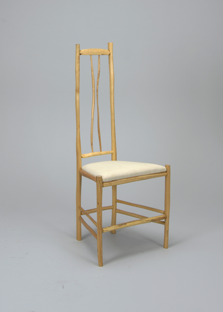 This is a dining chair. It was designed by Daniel Mack. It is dated 1991 and we acquired it in 1991. Its medium is spalted maple, fabric. It is a part of the Product Design and Decorative Arts department.