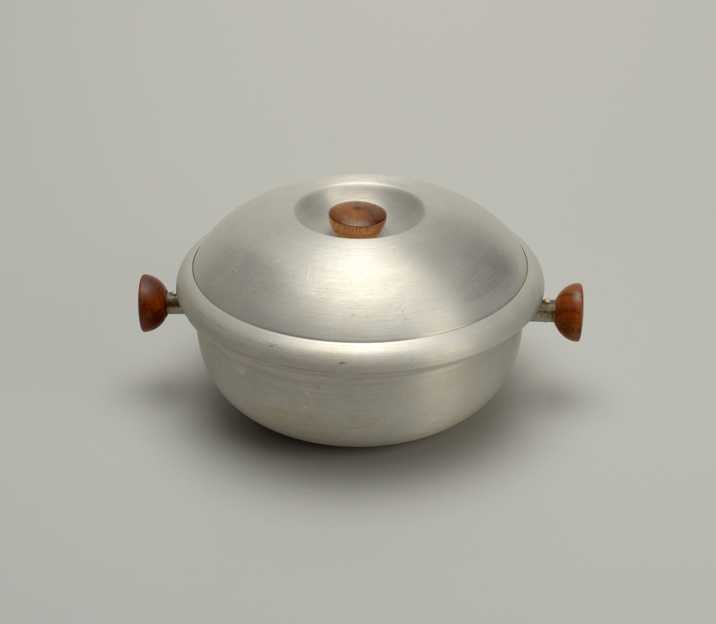 This is a Pot and lid. It was designed by Russel Wright. It is dated 1930–40 and we acquired it in 1991. Its medium is spun aluminum, wood. It is a part of the Product Design and Decorative Arts department.