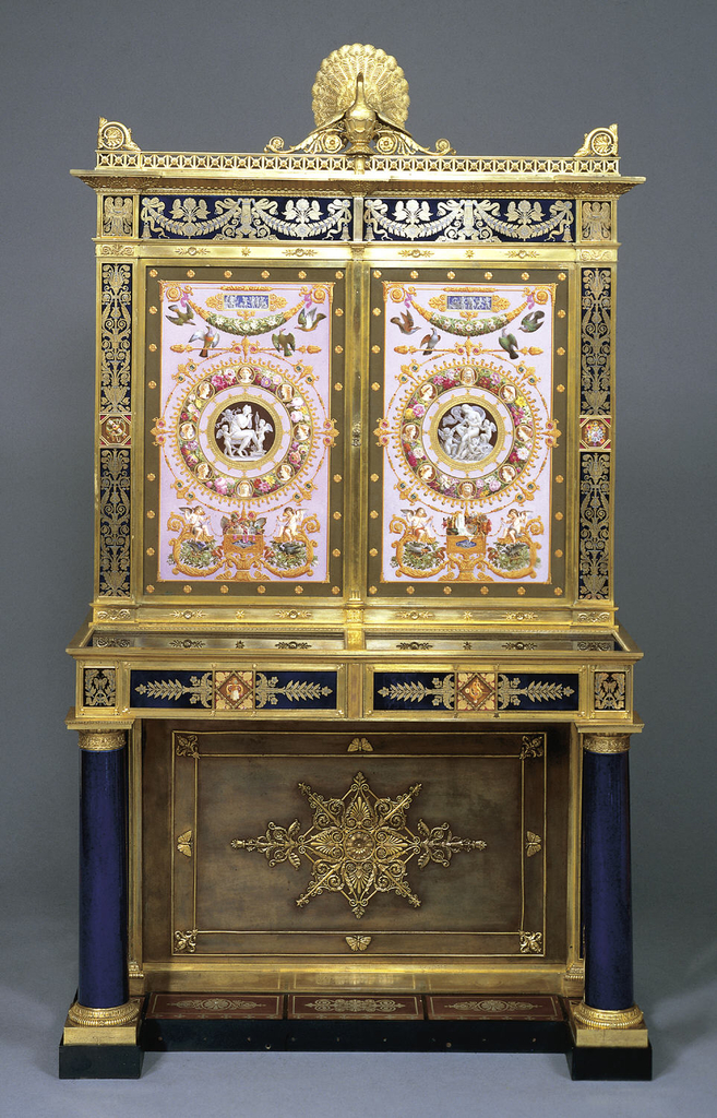 This is a cabinet. It was designed by Jean-Charles-Francois Leloy and Alexandre Évariste Fragonard and mount made by Louis-Honoré Boquet and Boullemier le jeune (the younger), probably Antoine-Gabriel Boullemier (French, 1781-1842) and Boullemier l'ainé (the elder), probably Francois Antoine Boullemier (French, 1773-1838) and executor: Pierre Huard and production directed by Alexandre Brongniart and Vicomte de La Rochefoucauld and painted by Pierre Huard, Riton and Antoine Béranger and manufactured by Godin (probably the younger) and Sèvres Porcelain Manufactory and patron: Charles X, King of France. It is dated 1825–1826 and we acquired it in 1990. Its medium is mahogany, platinum, glass, bronze, gold, hard paste porcelain, vitreous enamel. It is a part of the Product Design and Decorative Arts department.