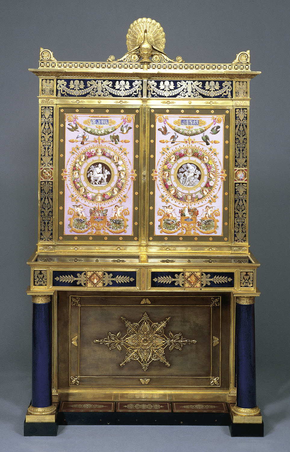 This cabinet was displayed in 1827 at the annual New Year's Day exhibition of the finest products made at the Royal Factory during the previous year. The cabinet was recorded with a sale price of 24,000 francs, an exceptional amount for a piece fo furniture at that time.