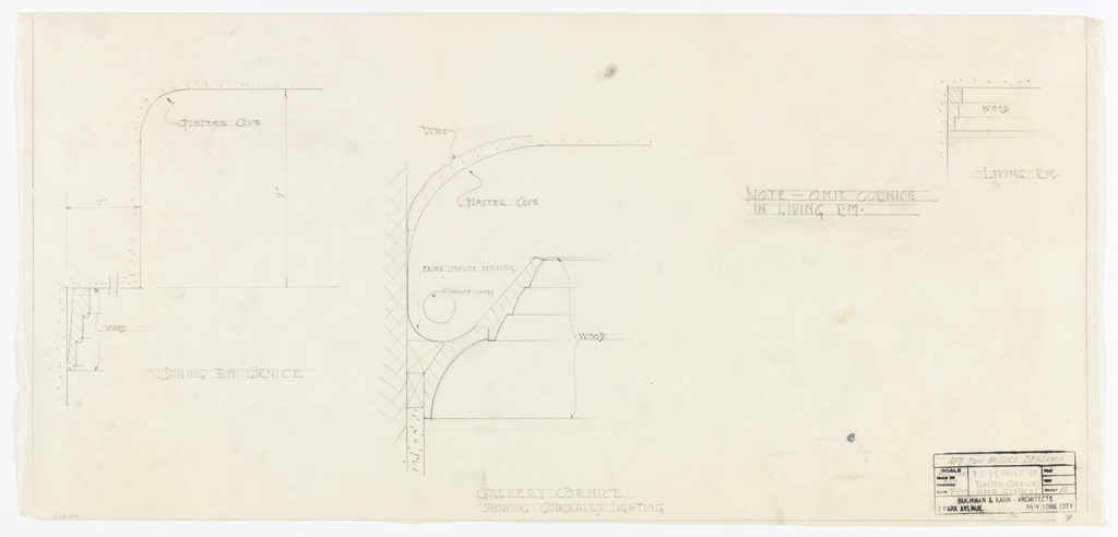 Stamp in black ink, lower right: APT. FOR MAURICE BENJAMIN / F. S. DETAILS OF MASTER CORNICES / WOOD CORNICES; dated: 7/11/29
