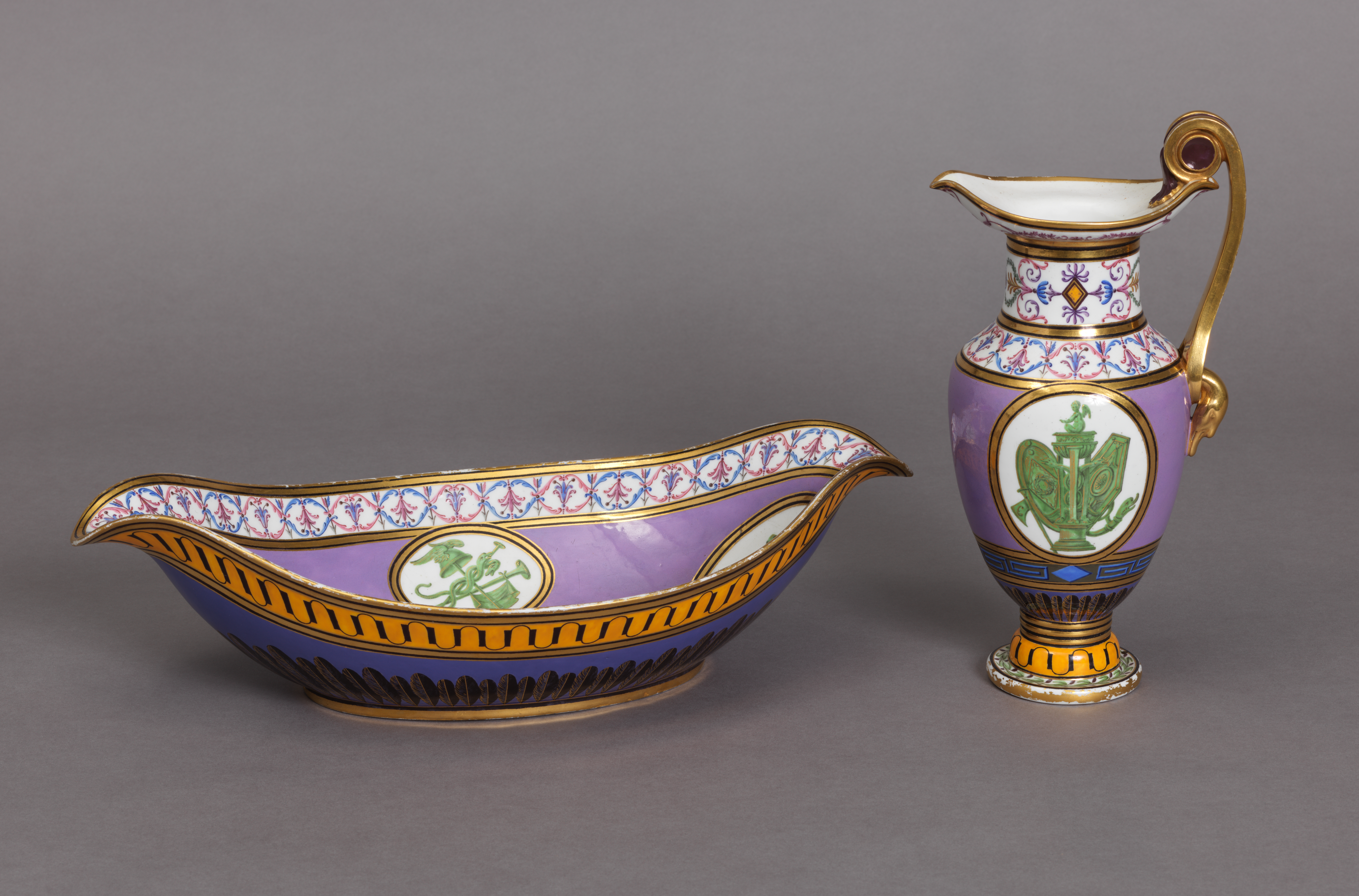 This is a ewer. It was manufactured by Sèvres Porcelain Manufactory. It is dated ca. 1800 and we acquired it in 1991. Its medium is porcelain (possibly soft paste), vitreous enamel, gold. It is a part of the Product Design and Decorative Arts department.