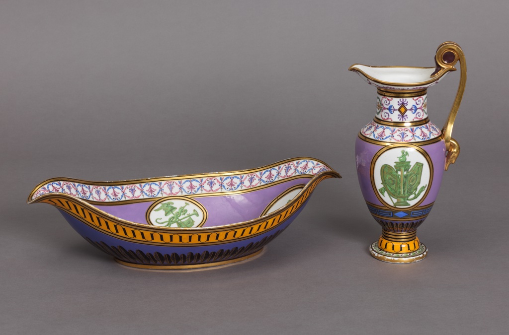 The Sevres porcelain factory enjoyed royal patronage in the eighteenth century, but was declared state property after the Revolution. In 1800, Napoleon engaged Alexandre Brongniart as director of the factory and made sweeping changes intended to make the factory financially and artistically successful. New ground colors and patterns were introduced by talented painters working at the factory. ( A Royal Gift, 1994-95).