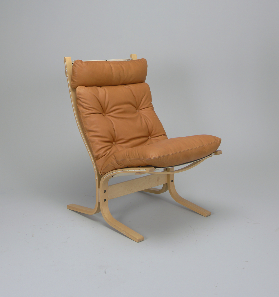 Chair (Norway); Designed by Ingmar Relling (Norwegian, 1920 - 2002); Produced by Vestlandske Mobelfabrikk (Norway); laminated bent beach, canvas, leather; H x W x D: 99.5 x 66 x 86 cm (39 3/16 in. x 26 in. x 33 7/8 in.); 1991-5-1-a/c