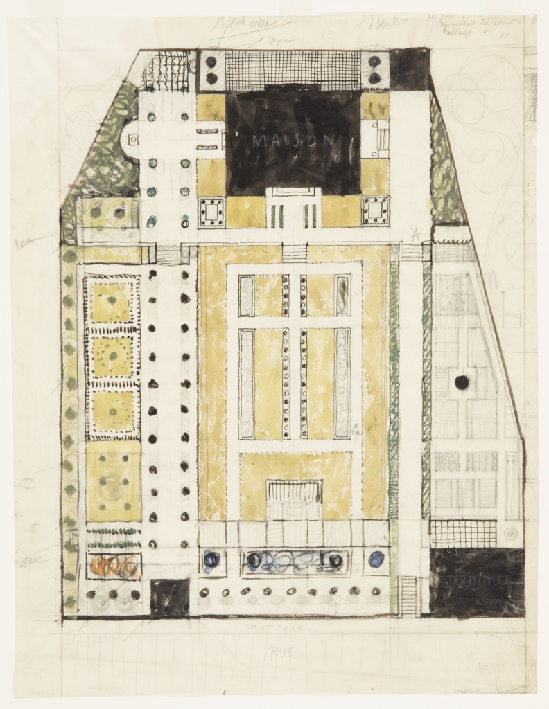 Drawing, Ground Plan of a Formal Garden; Designed by André Vera (French, active Paris, 1881–1971), Paul Vera (French, active Paris, 1882–1957); Drafted by Eugène Verdeau (French); France; pen and black ink, brush and green, blue, orange watercolor, graphite on tracing paper; 41.8 × 32.3 cm (16 7/16 × 12 11/16 in.) Mat: 55.9 × 40.6 cm (22 × 16 in.); Museum purchase from Smithsonian Institution Collections Acquisition Program Fund; 1991-58-15