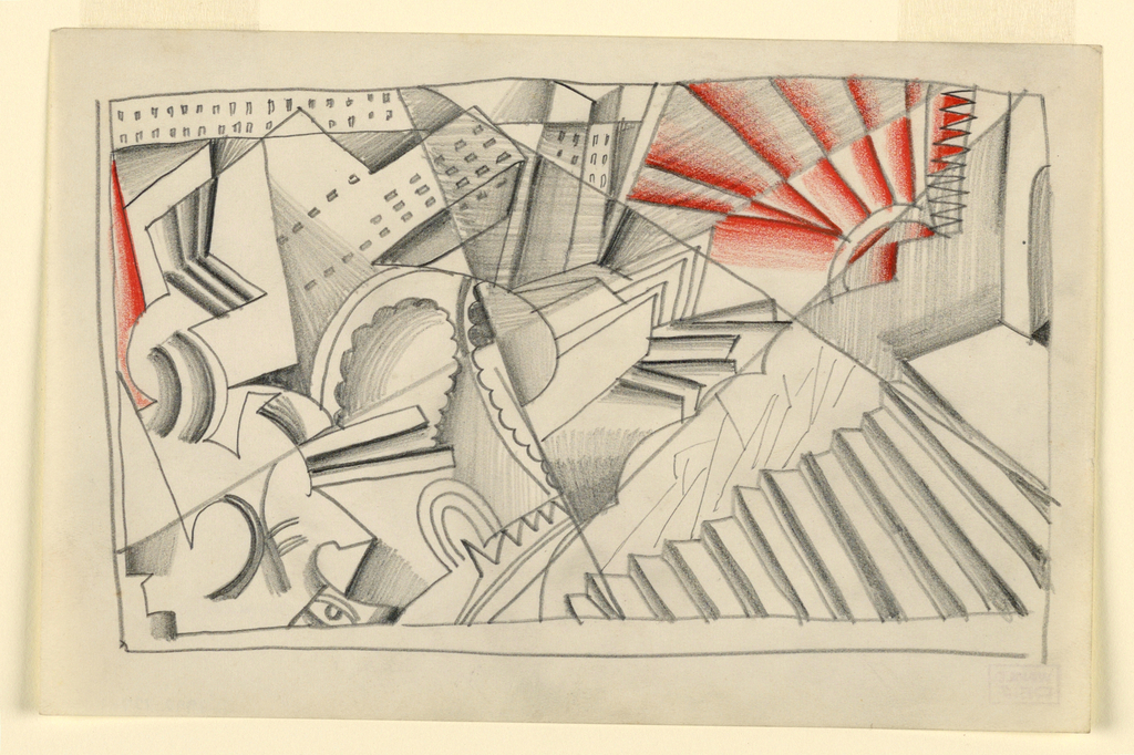 Drawing, Abstract Cityscape; Designed by Winold Reiss (American, b. Germany, 1886–1953); USA; graphite, orange crayon on wove paper; H x W: 14 × 21.5 cm (5 1/2 × 8 7/16 in.); Gift of Anonymous Donor; 1992-127-1