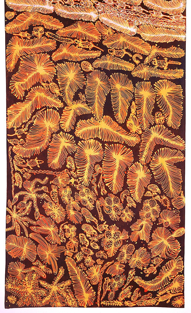 Judith Kngwarreye’s Tharrakarre combines bush plants, reptiles and insects in a dynamic composition. Most prominent is the plume-like form of the honey grevillea (tharrkarre), a plant that produces nectar that can be sucked directly from the flower or stirred in water to make a sweet drink. Amid these brilliant orange flowers are darting lizards and snakes, along with centipedes, cicadas and head lice. All these animals fit in to the scheme of both everyday life and the Dreamtime, the time of the Ancestor Beings at the beginning of creation.