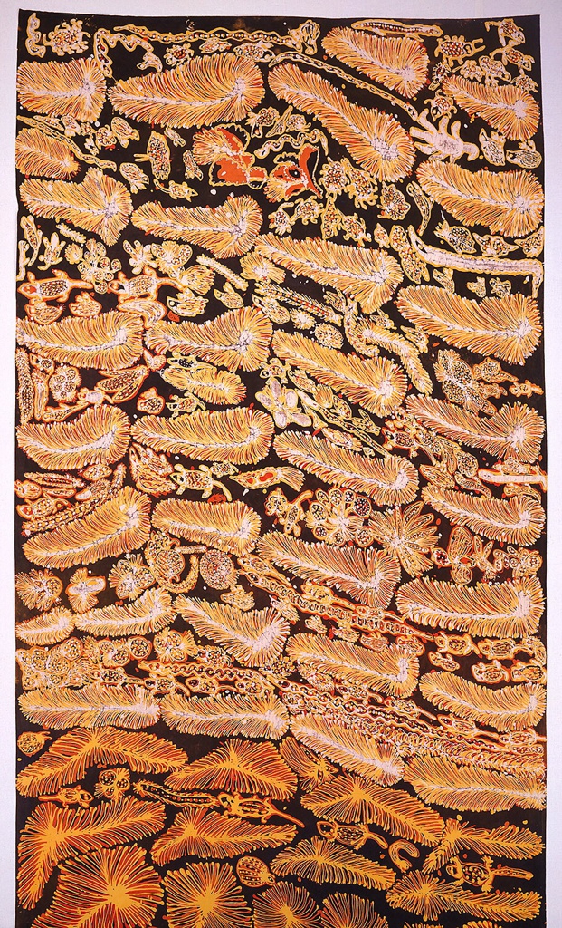Judith Kngwarreye’s Tharrakarre combines bush plants, reptiles and insects in a dynamic composition. Most prominent is the plume-like form of the honey grevillea (tharrkarre), a plant that produces nectar that can be sucked directly from the flower or stirred in water to make a sweet drink. Amid these brilliant orange flowers are darting lizards and snakes, along with centipedes, cicadas and head lice. All these animals fit in to the scheme of both everyday life and the Dreamtime, the time of the Ancestor Beings at the beginning of creation.
