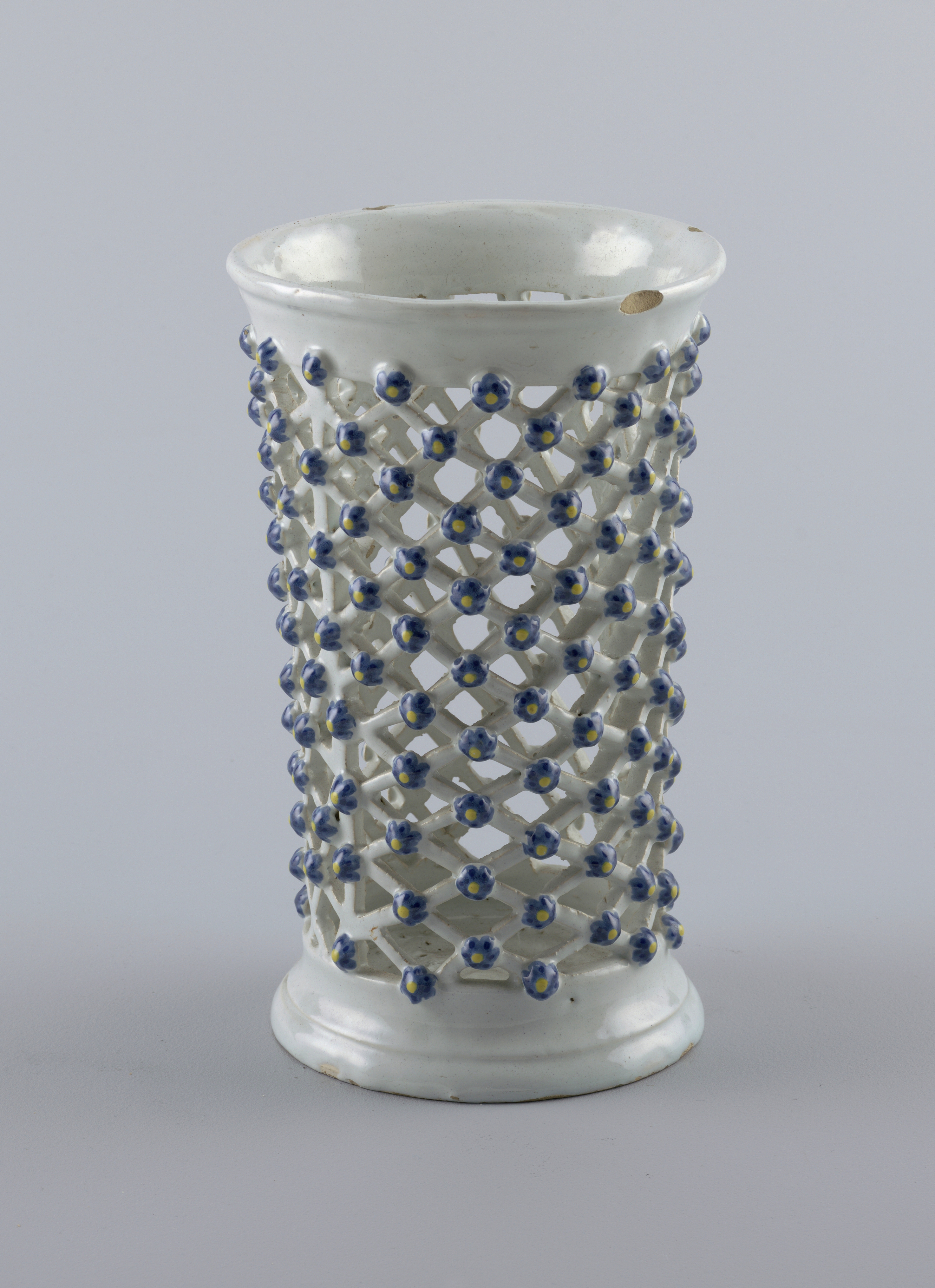 This is a Vase. It was manufactured by Munden. It is dated ca. 1750 and we acquired it in 1992. Its medium is tin-glazed earthenware. It is a part of the Product Design and Decorative Arts department.