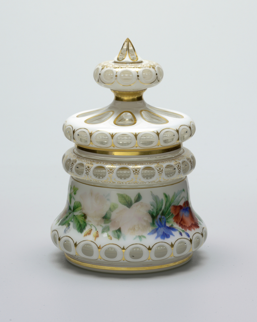 This is a Scent bottle and lid. It is dated ca. 1870 and we acquired it in 1992. Its medium is enameled and gilt glass. It is a part of the Product Design and Decorative Arts department.