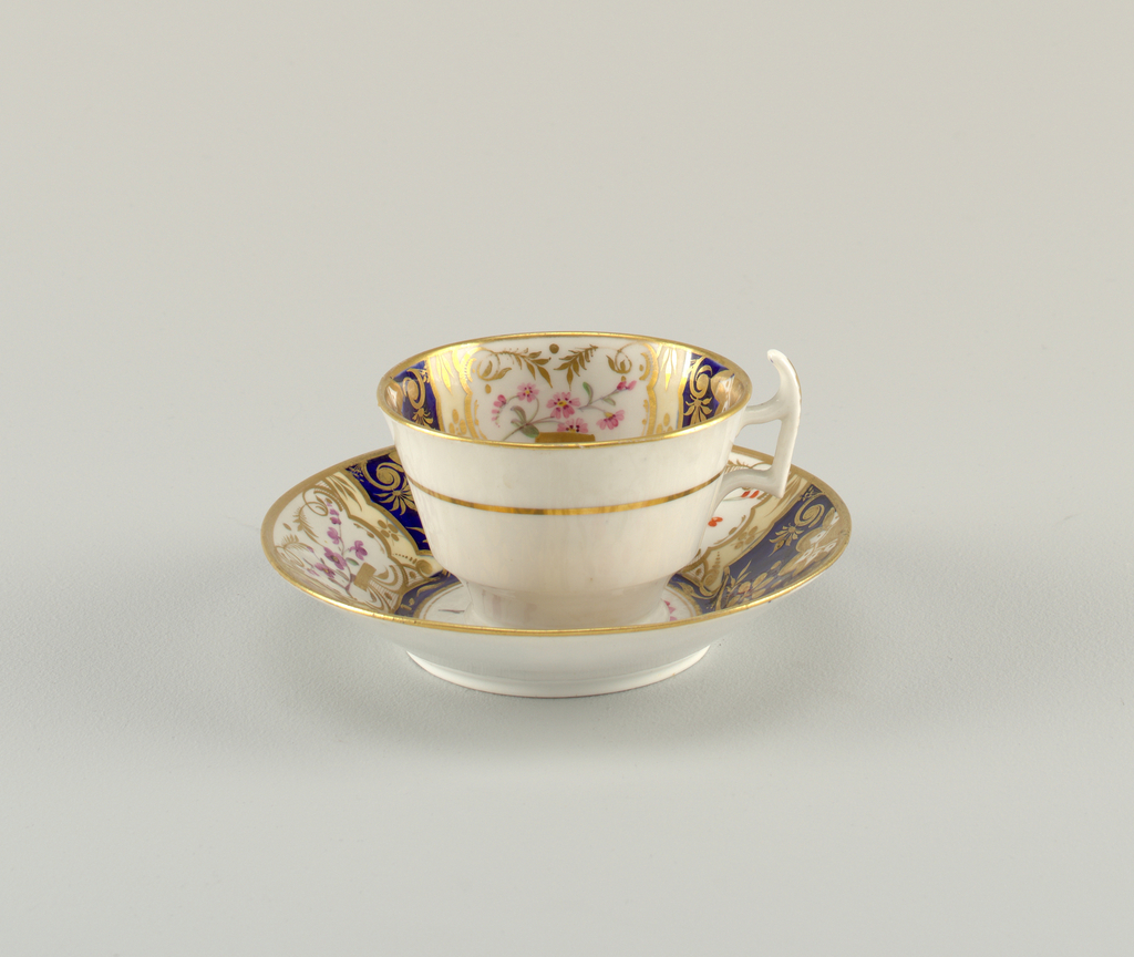 This is a cup and saucer. It was possibly by Copeland & Garrett. It is dated 19th century and we acquired it in 1992. Its medium is porcelain, vitreous enamel, gold. It is a part of the Product Design and Decorative Arts department.