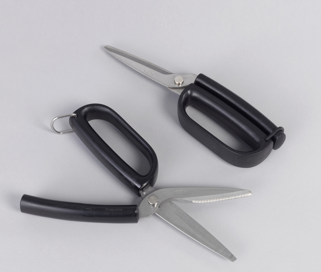 This is a scissors. It was designed by Stephen Russak, Stephen Allendorf, Daniel Formosa, Tucker Viemeister, Davin Stowell, Michael Calahan, Jürgen Laub, Stephen Wahl and Sam Farber and manufactured by OXO International and firm: Smart Design, Inc.. It is dated ca. 1990 and we acquired it in 1992. Its medium is stainless steel, santoprene (thermoplastic rubber), abs plastic. It is a part of the Product Design and Decorative Arts department.