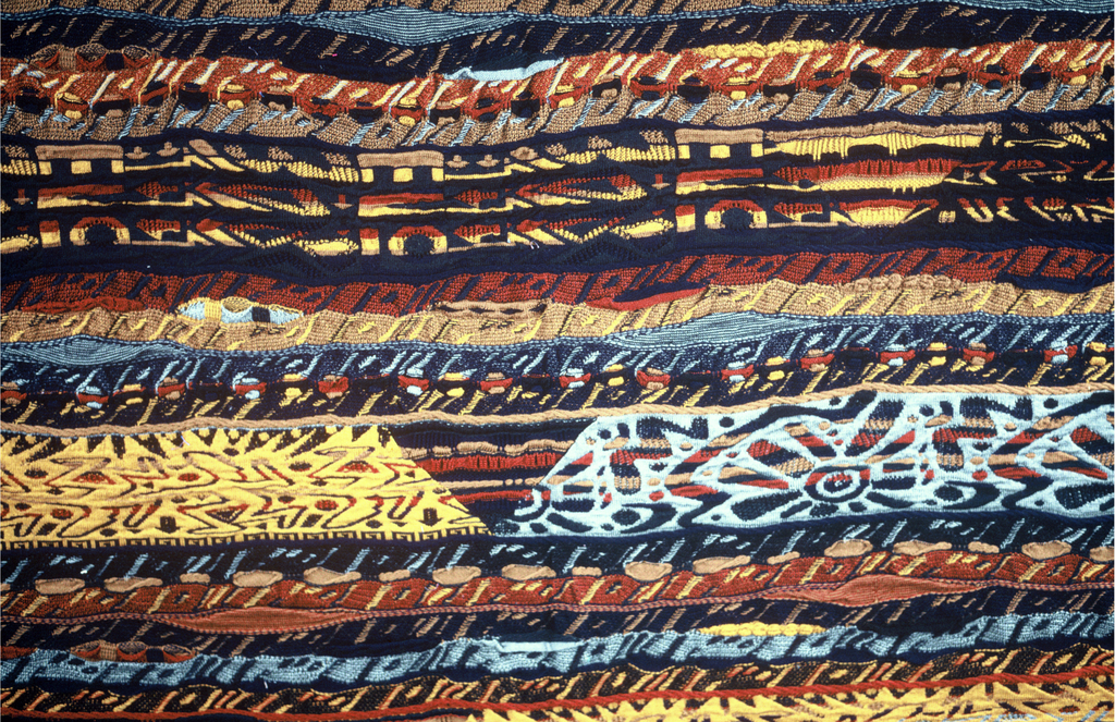 This is a panel. It was produced by COOGI AUSTRALIA. It is dated 1991 and we acquired it in 1992. Its medium is wool and its technique is machine knit. It is a part of the Textiles department.