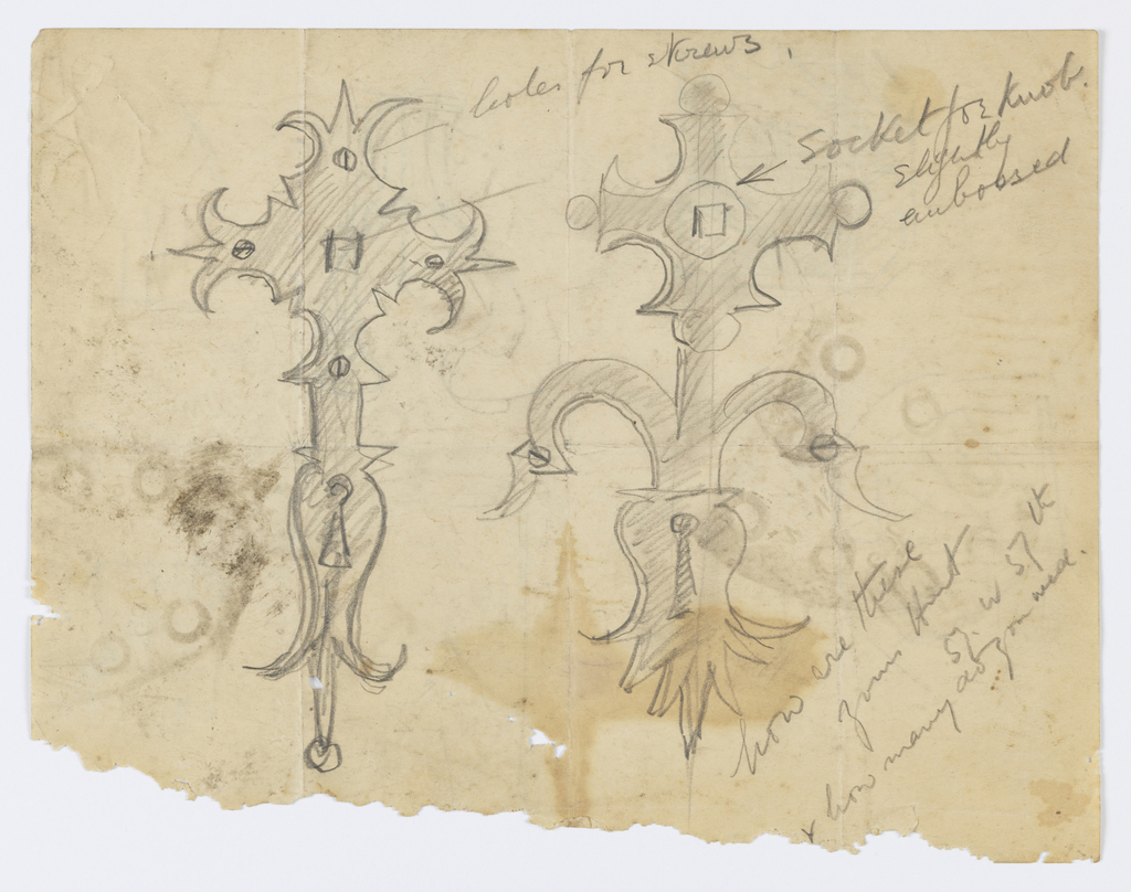 Inscribed in graphite, upper center: holes for skrews.; upper right: socket for knob. / slightly / embossed; lower right: how are these / your Hunt / 57. W 57 UK / how many [illegible]