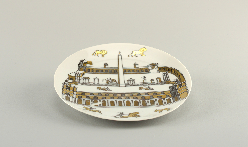 This is a plate. It was designed by Piero Fornasetti. It is dated 20th century and we acquired it in 1993. Its medium is porcelain. It is a part of the Product Design and Decorative Arts department.