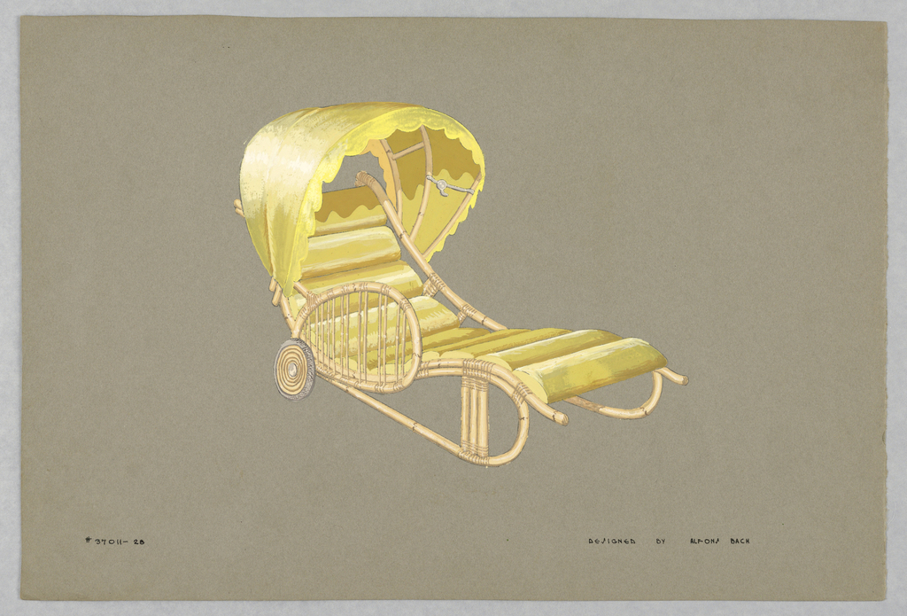 Drawing, 28. Bamboo chaise longue; Designed by Alfons Bach (American, b. Germany, 1904–1999); USA; chalk, watercolor; Gift of Alfons Bach; 1993-108-162