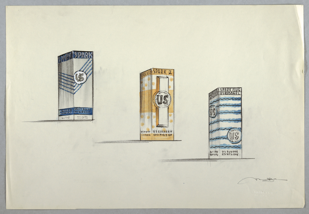 Drawing, Three battery packages; Designed by Alfons Bach (American, b. Germany, 1904–1999); USA; watercolor, graphite, off-white paper; Gift of Alfons Bach; 1993-108-39