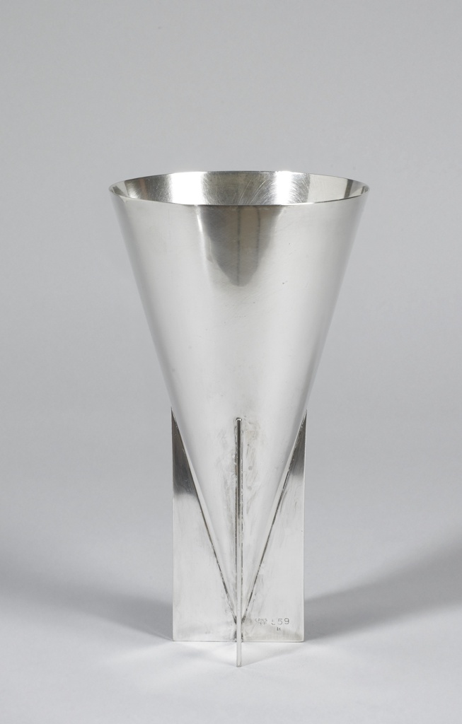Ilonka Karasz developed the idea of using one form and adapting it by adding new elements to it. This cone-shaped object is thus changed by the addition of four triangular planes forming a cross at the base. In fact, Karasz tried to create objects featuring various planes and smooth surfaces.