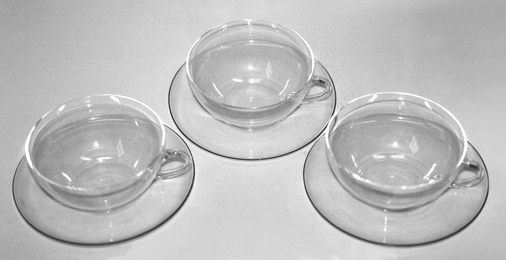 This is a cup and saucer. It is dated 1932 and we acquired it in 1993. Its medium is mold-blown and tooled glass. It is a part of the Product Design and Decorative Arts department.
