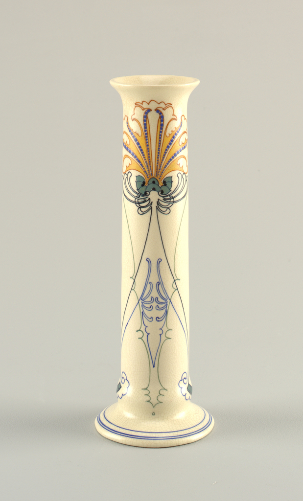 This is a Vase. It was manufactured by Arnhem Faience Factory. It is dated 1910–1920 and we acquired it in 1993. Its medium is earthenware. It is a part of the Product Design and Decorative Arts department.