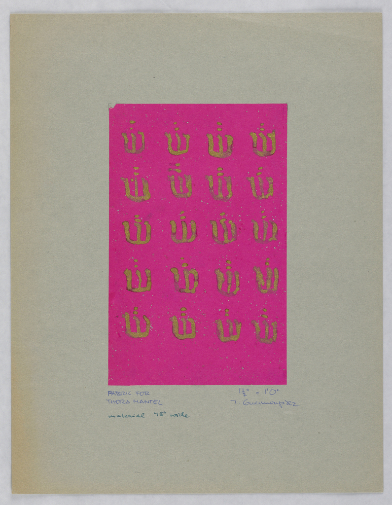 Drawing, Design for Woven Torah Cover with Repeating "Shin"; USA; brush and gold, silver paint on colored paper; H x W: 23.5 × 13.3 cm (9 1/4 × 5 1/4 in.); Gift of Mr. Eric and Mrs. Sylvia Elsesser, The Trude Guermonprez Archives; 1993-121-47