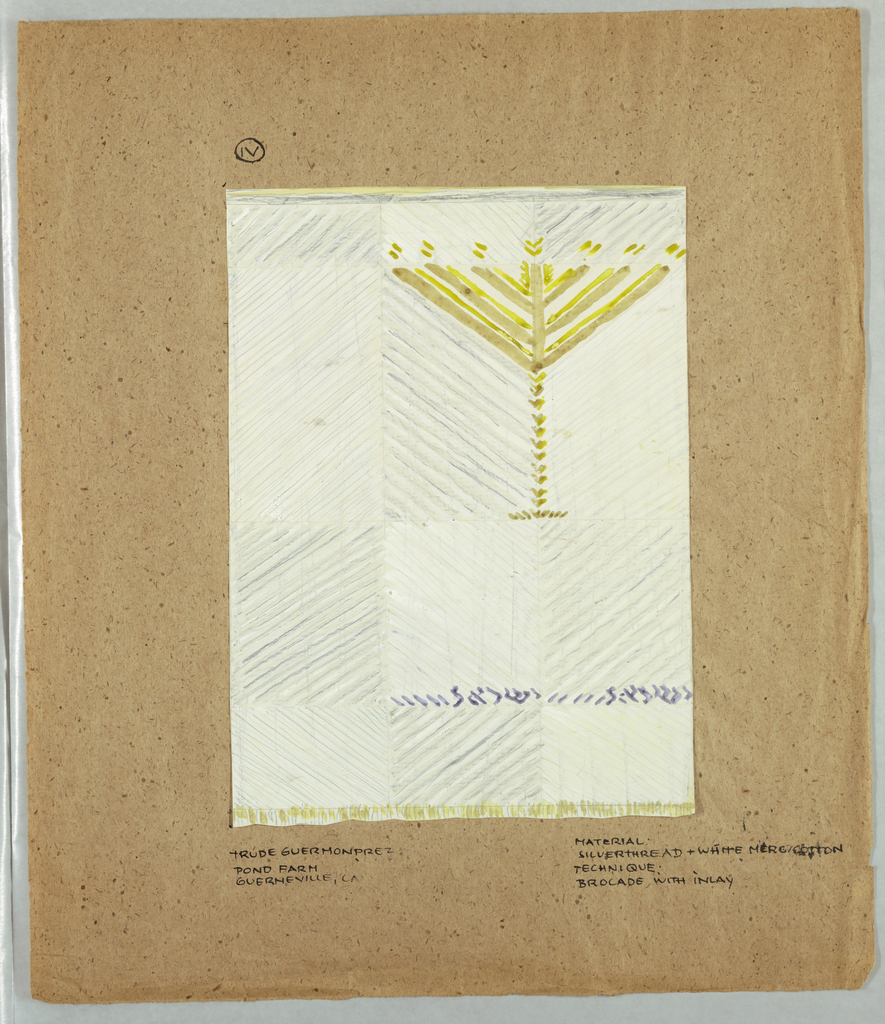 Inscribed in brush and purple watercolor, lower third of drawing, center right: Yisrael [twice, in Hebrew characters]; in pen and black ink, on mount, beneath right corner of drawing: MATERIAL/SILVERTHREAD (sic) + WHITE / MERO / COTTON / TECHNIQUE: / BROCADE WITH INLAY; on mount, above upper left corner of drawing: IV [encircled]