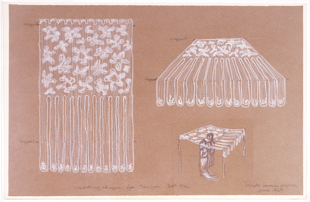 Drawing, Three Views of a Wedding Canopy, Beth Am Synagogue, Los Altos, CA; USA; white crayon over graphite on brown paper (partially overlaid with second piece of paper), mounted on cardboard; H x W: 31.4 × 48.3 cm (12 3/8 in. × 19 in.); Gift of Mr. Eric and Mrs. Sylvia Elsesser, The Trude Guermonprez Archives; 1993-121-74