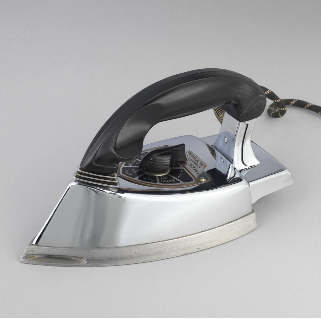 A thermostatic iron with a phenolic resin handle contoured for ergonomic comfort, this design was produced at least as early as the mid-1930s making it an early example of streamlining. General Electric continued to produce other more conservative designs but sold the Moderne as a top-of-the-line iron.