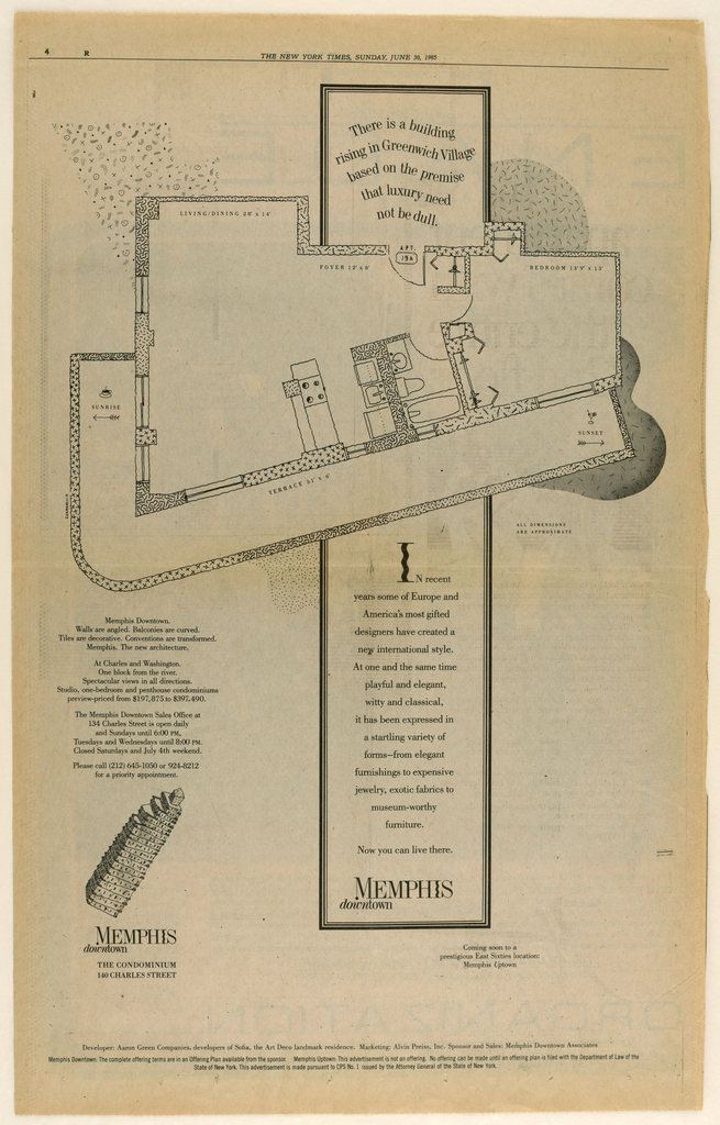 Advertisement, Memphis (Condominiums): New York Times Advertisement; Designed by M&Co (United States); USA; Gift of Tibor Kalman/ M & Co.; 1993-151-127