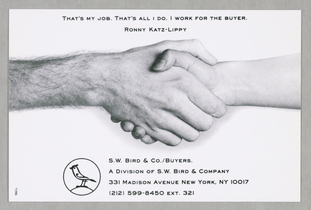 Advertisement, S.W. Bird & Co.: Card Set; Design Director: Tibor Kalman (American, b. Hungary, 1949–1999); Firm: M&Co (United States); USA; offset lithography; 1993-151-161a - 10.0 x 15.2 cm (4 x 6 in.) 1993-151-161b - 10.0 x 15.2 xm (4 x 6 in.) 1993-151-161c - 10.0 x 15.2 cm (4 x 6 in.) 1993-151-161d - 10.0 x 15.2 cm (4 x 6 in.) 1993-151-161e - 10.0 x 15.2 cm (4 x 6 in.) 1993 -151-161f - 10.0 x 15.2 cm (4 x 6 in.) 1993-151-161g - 10.0 x 15.2 cm (4 x 6 in.); Gift of Tibor Kalman/ M & Co.; 1993-151-161-a/g