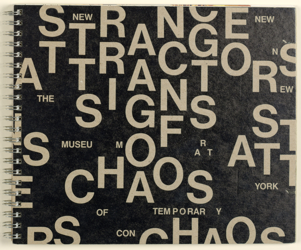 Catalog, New Museum of Contemporary Art: Strange Attractors/ Signs of Chaos; Design Director: Tibor Kalman (American, b. Hungary, 1949–1999); Firm: M&Co (United States); USA; offset lithography; 19 x 22.6 cm (7 1/2 x 9 in), closed 19 x 46 cm (7 1/2 x 18 in.), opened; Gift of Tibor Kalman/ M & Co.; 1993-151-359