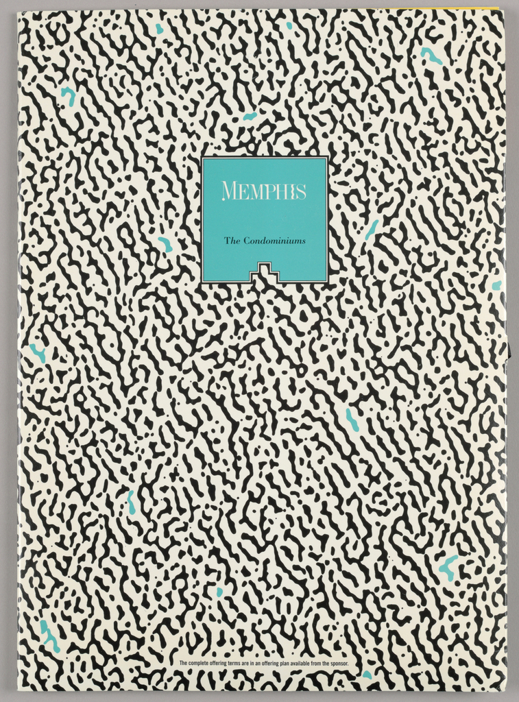 Brochure, Memphis (Condominiums): Portfolio; Design Director: Tibor Kalman (American, b. Hungary, 1949–1999); USA; offset lithography; 1. portfolio- 35.5 x 25.3 cm (14 x 10 in.), closed; 35.5 x 50.9 cm (14 x 20 1/8 in.), opened; left-hand inside pocket- 27.3 x 25.6 cm (11 x 9 7/8 in.); right-hand inside pocket- 27.3 x 12.4 cm (11 x 4 7/8 in.) 1/ 5. floor plans- 32.8 x 21.5 cm (13 x 8 1/2 in.), closed; 57.8 x 73.2 cm (22 3/4 x 28 7/8 in.), opened. 6. accordian fold insert- 15.2 x 12.5 cm (6 x 5 in.), closed; 15.2 x 49.4 cm (6 x 19 1/2 in.), opened. 7. M brochure- 35 x 11.8 cm (13 7/8 x 4 5/8 in.), closed; 35 x 23.6 cm (13 7/8 x 9 1/4 in.), opened. 8. Apartments brochure- 33 x 11 cm (13 x 4 3/8 in.) closed; 33 x 22.1 cm (13 x 8 3/4 in.), opened.; Gift of Tibor Kalman/ M & Co.; 1993-151-363-1/8