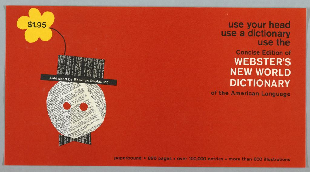Printed in black, upper left within yellow flower: $1.95; in white, along brim of hat: published by Meridian Books, Inc.; in black and white, upper right: use your head / use a dictionary / use the / Concise Edition of / WEBSTER'S / NEW WORLD / DICTIONARY / of the American Language; in black, at bottom right: paperbound - 896 pages - over 100,000 entries - more than 600 illustrations