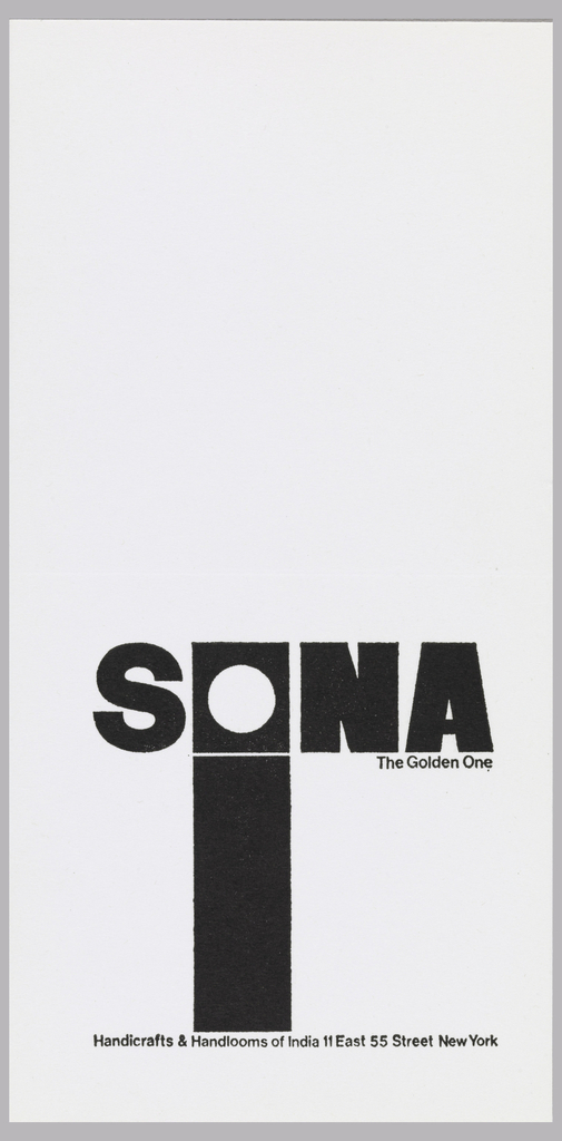 Printed in black: SONA / The Golden One; in black, at bottom: Handicrafts & Handlooms of India 11 East 55 Street New York.