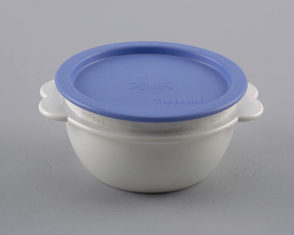 This is a Bowl and lid. It was designed by Morison S. Cousins, Brian L. Aiken and Douglas M. Laib and manufactured by Tupperware Corporation. It is dated 1992 and we acquired it in 1993. Its medium is plastic (polypropylene, polyethylene). It is a part of the Product Design and Decorative Arts department.
