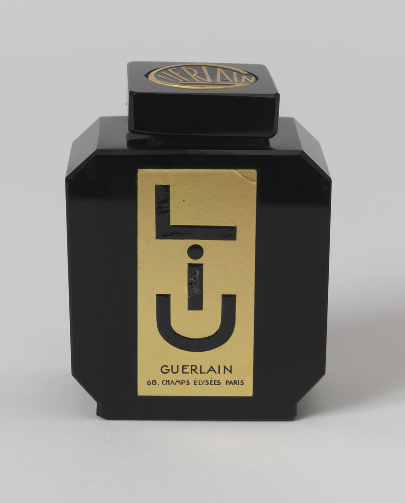 This is a Perfume bottle and packaging. It was produced by Guerlain. It is dated introduced 1929 and we acquired it in 1993. Its medium is glass, paper, metal. It is a part of the Product Design and Decorative Arts department.