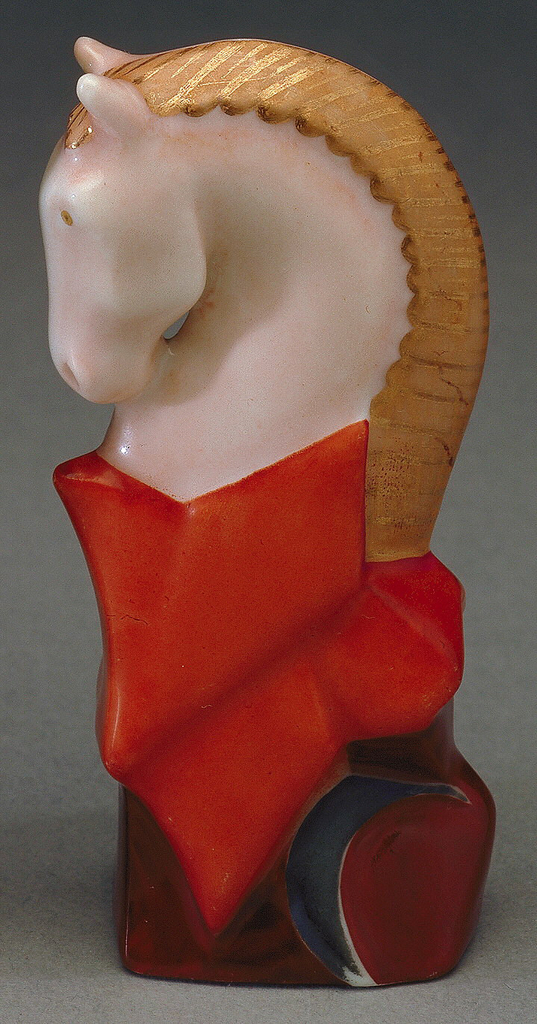 The Reds versus the Whites Chess Set; Designed by Natalya Yakovlevna Danko (Russian, b. Georgia, 1892–1942); Manufactured by Lomonosov Porcelain Factory (Russia); glazed and molded porcelain; H x W x D (a): 10.8 x 3.8 x 3.5 cm (4 1/4 x 1 1/2 x 1 3/8 in.) H x W x D (b): 10 x 4.1 x 3.9 cm (3 15/16 x 1 5/8 x 1 9/16 in.) H x W x D (c): 9.5 x 3.6 x 3.5 cm (3 3/4 x 1 7/16 x 1 3/8 in.) H x W x D (d): 9.6 x 3.7 x 3.5 cm (3 3/4 x 1 7/16 x 1 3/8 in.) H x W x D (e): 7.6 x 3.5 x 2.6 cm (3 in. x 1 3/8 in. x 1 in.) H x W x D (f): 7.7 x 3.4 x 2.4 cm (3 1/16 x 1 5/16 x 15/16 in.) H x W x D (g): 6.6 x 5.2 x 2.7 cm (2 5/8 x 2 1/16 x 1 1/16 in.) H x W x D (h): 6.8 x 5.3 x 2.7 cm (2 11/16 x 2 1/16 x 1 1/16 in.) H x W x D (i): 5.8 x 3.9 x 2.5 cm (2 5/16 in. x 1 9/16 in. x 1 in.) H x W x D (j): 5.9 x 3.9 x 2.6 cm (2 5/16 in. x 1 9/16 in. x 1 in.) H x W x D (k): 6 x 4 x 2.6 cm (2 3/8 in. x 1 9/16 in. x 1 in.) H x W x D (l): 5.9 x 3.9 x 2.5 cm (2 5/16 in. x 1 9/16 in. x 1 in.) H x W x D (m): 6 x 3.9 x 2.5 cm (2 3/8 in. x 1 9/16 in. x 1 in.) H x W x D (n): 5.8 x 3.9 x 2.5 cm (2 5/16 in. x 1 9/16 in. x 1 in.) H x W x D (o): 6 x 4 x 2.6 cm (2 3/8 in. x 1 9/16 in. x 1 in.) H x W x D (p): 5.9 x 3.9 x 2.5 cm (2 5/16 in. x 1 9/16 in. x 1 in.) H x W x D (q): 10.9 x 3.8 x 3.6 cm (4 5/16 x 1 1/2 x 1 7/16 in.) H x W x D (r): 9.7 x 3.8 x 3.6 cm (3 13/16 x 1 1/2 x 1 7/16 in.) H x W x D (s): 9.7 x 3.5 x 3 cm (3 13/16 x 1 3/8 x 1 3/16 in.) H x W x D (t): 9.4 x 3.9 x 3.4 cm (3 11/16 x 1 9/16 x 1 5/16 in.) H x W x D (u): 9.5 x 4 x 3.4 cm (3 3/4 x 1 9/16 x 1 5/16 in.) H x W x D (v): 8.1 x 3.9 x 2.8 cm (3 3/16 x 1 9/16 x 1 1/8 in.) H x W x D (w): 8 x 3.7 x 2.8 cm (3 1/8 x 1 7/16 x 1 1/8 in.) H x W x D (x): 6.2 x 5 x 2.5 cm (2 7/16 in. x 1 15/16 in. x 1 in.) H x W x D (y): 6.2 x 5 x 2.4 cm (2 7/16 x 1 15/16 x 15/16 in.) H x W x D (z): 5.8 x 3.3 x 2.3 cm (2 5/16 x 1 5/16 x 7/8 in.) H x W x D (aa): 5.6 x 3.4 x 2.4 cm (2 3/16 x 1 5/16 x 15/16 in.) H x W x D (bb): 5.5 x 3.3 x 2.4 cm (2 3/16 x 1 5/16 x 15/16 in.) H x W x D (cc): 5.5 x 3.2 x 2.3 cm (2 3/16 x 1 1/4 x 7/8 in.) H x W x D (dd): 5.6 x 3 x 2.4 cm (2 3/16 x 1 3/16 x 15/16 in.) H x W x D (ee): 5.5 x 3.2 x 2.4 cm (2 3/16 x 1 1/4 x 15/16 in.) H x W x D (ff): 5.7 x 3.4 x 2.4 cm (2 1/4 x 1 5/16 x 15/16 in.); Gift of Charlotte Y. Salisbury in loving memory of her husband, Harrison E. Salisbury; 1994-122-5-a/ff