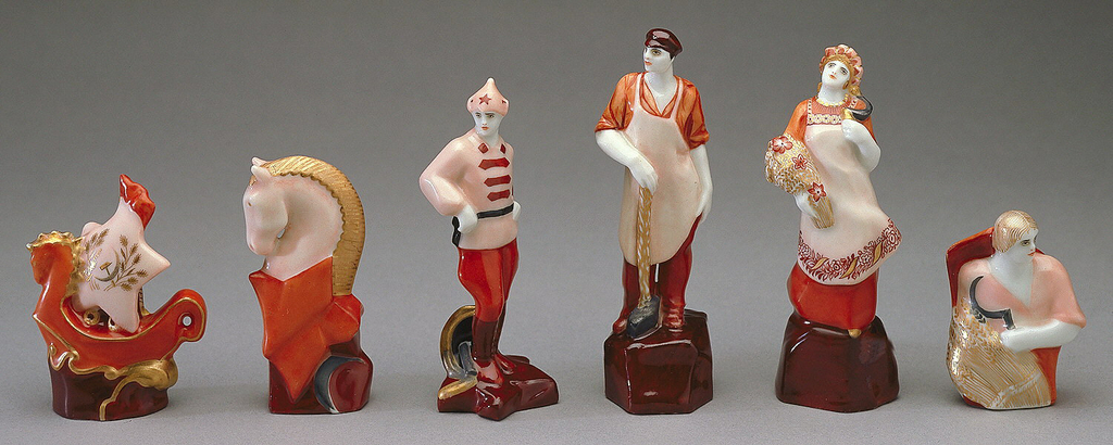 The Reds versus the Whites Chess Set; Designed by Natalya Yakovlevna Danko (Russian, b. Georgia, 1892–1942); Manufactured by Lomonosov Porcelain Factory (Russia); glazed and molded porcelain; H x W x D (a): 10.8 x 3.8 x 3.5 cm (4 1/4 x 1 1/2 x 1 3/8 in.) H x W x D (b): 10 x 4.1 x 3.9 cm (3 15/16 x 1 5/8 x 1 9/16 in.) H x W x D (c): 9.5 x 3.6 x 3.5 cm (3 3/4 x 1 7/16 x 1 3/8 in.) H x W x D (d): 9.6 x 3.7 x 3.5 cm (3 3/4 x 1 7/16 x 1 3/8 in.) H x W x D (e): 7.6 x 3.5 x 2.6 cm (3 in. x 1 3/8 in. x 1 in.) H x W x D (f): 7.7 x 3.4 x 2.4 cm (3 1/16 x 1 5/16 x 15/16 in.) H x W x D (g): 6.6 x 5.2 x 2.7 cm (2 5/8 x 2 1/16 x 1 1/16 in.) H x W x D (h): 6.8 x 5.3 x 2.7 cm (2 11/16 x 2 1/16 x 1 1/16 in.) H x W x D (i): 5.8 x 3.9 x 2.5 cm (2 5/16 in. x 1 9/16 in. x 1 in.) H x W x D (j): 5.9 x 3.9 x 2.6 cm (2 5/16 in. x 1 9/16 in. x 1 in.) H x W x D (k): 6 x 4 x 2.6 cm (2 3/8 in. x 1 9/16 in. x 1 in.) H x W x D (l): 5.9 x 3.9 x 2.5 cm (2 5/16 in. x 1 9/16 in. x 1 in.) H x W x D (m): 6 x 3.9 x 2.5 cm (2 3/8 in. x 1 9/16 in. x 1 in.) H x W x D (n): 5.8 x 3.9 x 2.5 cm (2 5/16 in. x 1 9/16 in. x 1 in.) H x W x D (o): 6 x 4 x 2.6 cm (2 3/8 in. x 1 9/16 in. x 1 in.) H x W x D (p): 5.9 x 3.9 x 2.5 cm (2 5/16 in. x 1 9/16 in. x 1 in.) H x W x D (q): 10.9 x 3.8 x 3.6 cm (4 5/16 x 1 1/2 x 1 7/16 in.) H x W x D (r): 9.7 x 3.8 x 3.6 cm (3 13/16 x 1 1/2 x 1 7/16 in.) H x W x D (s): 9.7 x 3.5 x 3 cm (3 13/16 x 1 3/8 x 1 3/16 in.) H x W x D (t): 9.4 x 3.9 x 3.4 cm (3 11/16 x 1 9/16 x 1 5/16 in.) H x W x D (u): 9.5 x 4 x 3.4 cm (3 3/4 x 1 9/16 x 1 5/16 in.) H x W x D (v): 8.1 x 3.9 x 2.8 cm (3 3/16 x 1 9/16 x 1 1/8 in.) H x W x D (w): 8 x 3.7 x 2.8 cm (3 1/8 x 1 7/16 x 1 1/8 in.) H x W x D (x): 6.2 x 5 x 2.5 cm (2 7/16 in. x 1 15/16 in. x 1 in.) H x W x D (y): 6.2 x 5 x 2.4 cm (2 7/16 x 1 15/16 x 15/16 in.) H x W x D (z): 5.8 x 3.3 x 2.3 cm (2 5/16 x 1 5/16 x 7/8 in.) H x W x D (aa): 5.6 x 3.4 x 2.4 cm (2 3/16 x 1 5/16 x 15/16 in.) H x W x D (bb): 5.5 x 3.3 x 2.4 cm (2 3/16 x 1 5/16 x 15/16 in.) H x W x D (cc): 5.5 x 3.2 x 2.3 cm (2 3/16 x 1 1/4 x 7/8 in.) H x W x D (dd): 5.6 x 3 x 2.4 cm (2 3/16 x 1 3/16 x 15/16 in.) H x W x D (ee): 5.5 x 3.2 x 2.4 cm (2 3/16 x 1 1/4 x 15/16 in.) H x W x D (ff): 5.7 x 3.4 x 2.4 cm (2 1/4 x 1 5/16 x 15/16 in.); Gift of Charlotte Y. Salisbury in loving memory of her husband, Harrison E. Salisbury; 1994-122-5-a/ff