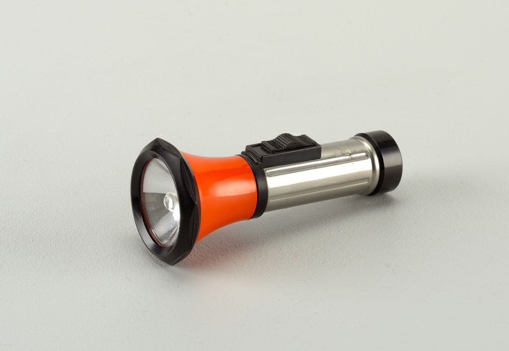 By the 1980s, flashlights not only had to be durable, they also needed multiple features in order to stand out in the growing variety of handheld lighting devices. Berec – the British Ever Ready Export Company, the South African subsidiary of Every Ready – developed this durable mixed-material flashlight to meet these demands. The conical orange and black plastic lamp housing partially turns and rises to create a second lighting setting: a focusing beam.